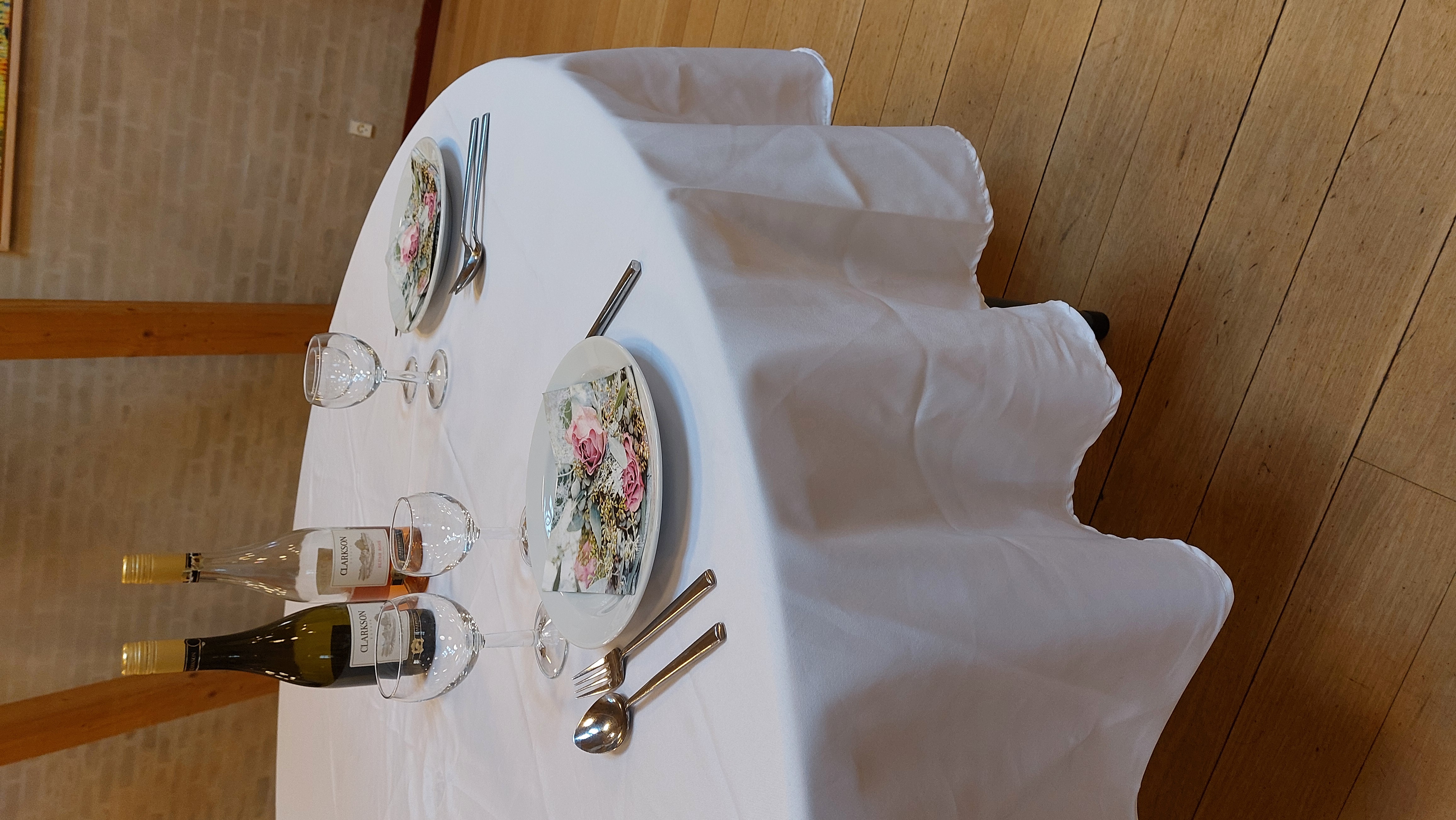 Der er 10 runde borde - diameter: 160 cm (Hvide duge kan lejes - 125 kr./stk.)